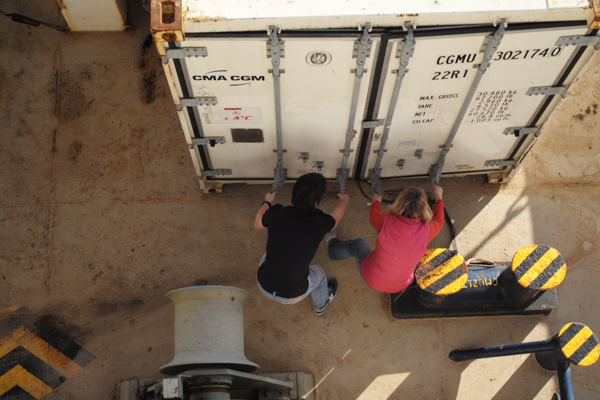 Voilà pour une première étape, ensuite celà devient très simple...  Le "reefer" va voyager comme n'importe quel reefer.  Déchargé à Walvis Bay en Namibie, il a déjà son billet de porte-container réservé pour aller au Havre.  Là il sera chargé sur un camion et acheminé à Gif-sur-Yvette, à la carothèque, l'excellente carothèque, du LSCE.  L'arrivée du reefer sera tout un événement!