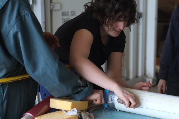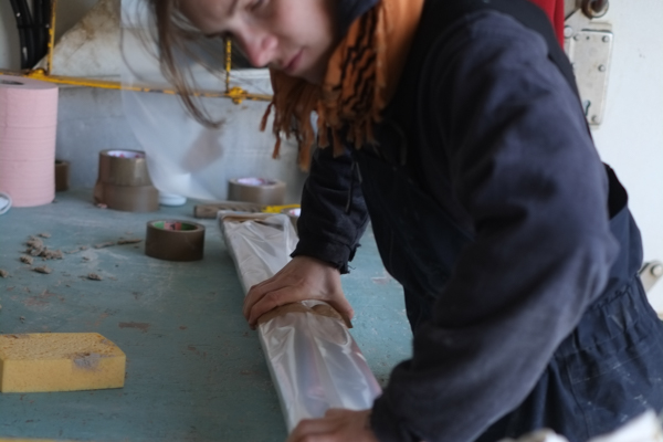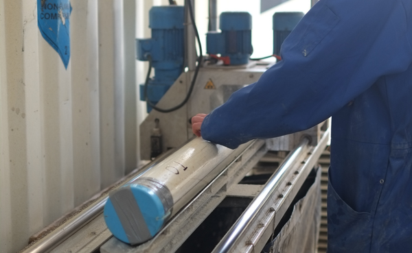 Il y a plusieurs étapes de découpe. Tout d’abord, une fois que le tube en plastique (le liner) est retiré du carottier et déposé sur le pont, il est découpé tous les 1,50 mètres avec un coupe tube.
