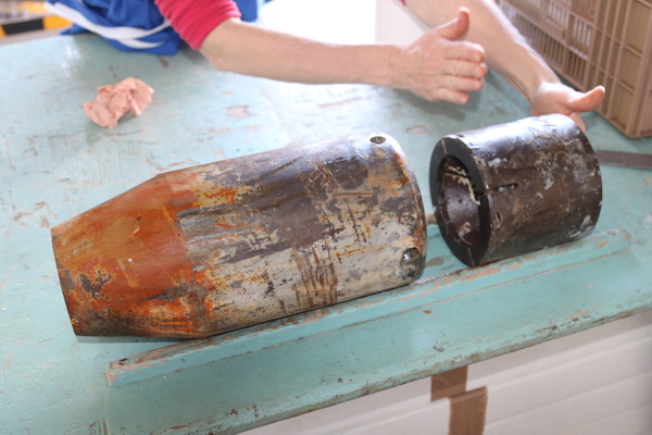 Sur la photo 1, vous pouvez voir une ogive qui se place au bout de la carotte. C'est cette partie qui s'enfonce dans le fond de la mer. La deuxième pièce s'emboîte dans l'ogive. Sur la photo 2, on peut apercevoir le système qui permet de retenir les sédiments : les sédiments entrent dans le tube, les 4 pétales sont pliés contre les parois du tube. Quand on tire sur le tube pour remonter la carotte, les 4 pétales sont repoussés vers le bas, se touchent et ferment l'ouverture. Il y a dans le tube un piston qui est poussé par les sédiments. Et ce piston chasse l'eau. C'est un peu comme une très grande seringue qui mesure 60 mètres. Il s'agit d'un système ingénieux.