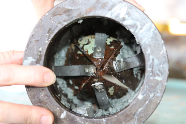 Le carottier est construit à bord par l’équipage. Il est un assemblage de plusieurs tubes en acier vissés les uns aux autres. A l’intérieur, de ce tube en acier sont glissés plusieurs longs tubes en pvc qui vont contenir le sédiment. Ce sont ces tubes qui sont découpés.