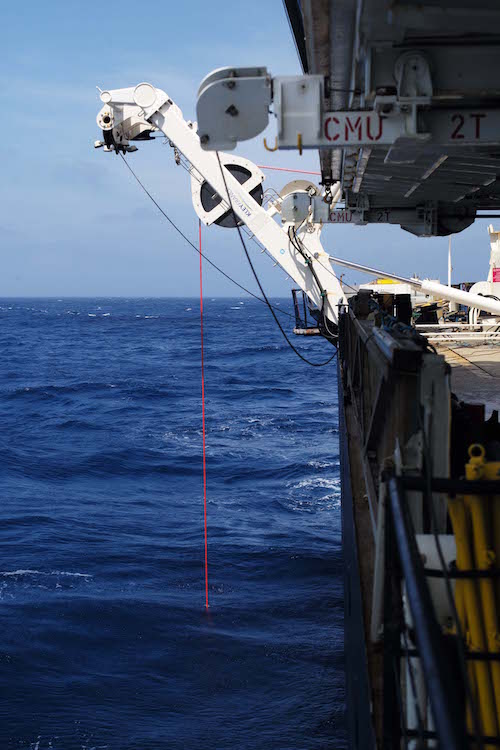 Pour remonter le tout nous disposons à bord d'un système de treuil, de portique et de poulie. Un (très) long cable est attaché au carottier (pour le descendre ET pour le monter). C'est un processus qui peut prendre beaucoup de temps aux grandes profondeurs.
