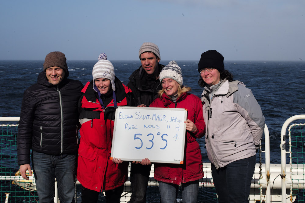 (*) Le panneau que tiennent Mary, Masa et Linda dit: "Ecole Saint Maur, Japon, avec nous à 53°S"